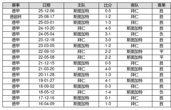 拜仁 VS 斯图加特两队近10年的交战次数为17场,拜仁13胜2平2负,赢球概率为76.5%,平局概率为11.8%,输球概率为11.8%。