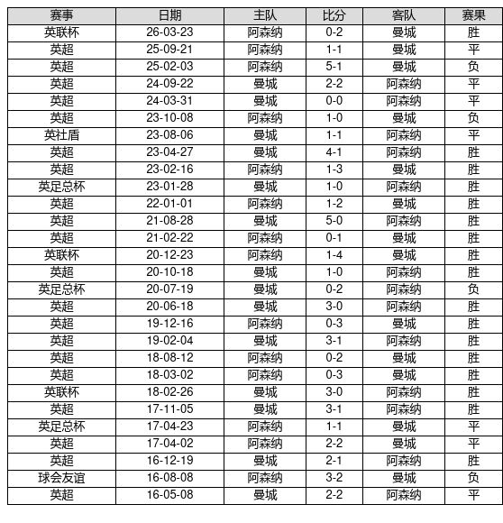 曼城 VS 阿森纳两队近10年的交战次数为28场,曼城17胜7平4负,赢球概率为60.7%,平局概率为25.0%,输球概率为14.3%。